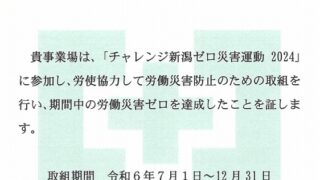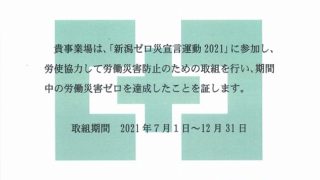 新潟労働局の新潟ゼロ災宣言運動2022に参加し、実施期間中のゼロ災を達成致しました。今後も安全な職場づくりに取り組みます。
