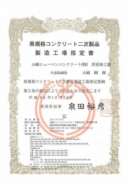 2013-01-04 / 最終更新日時 : 2020-02-11 yutaka 県規格コンクリート二次製品製造工場指定書を取得しました弊社は、新潟県農地部規格コンクリート二次製品製造工場指定を取得致しました。